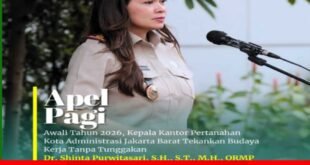 Portalindonews.com = _ – Membukalembaran kerja di tahun baru, Kantor Pertanahanmenggelar apel pagi perdana pada Senin (5/1/2026).Dalam kesempatan tersebut, Kepala Kantor lbu Shintabertindak langsung sebagai pembina apel danmenyampaikan arahan strategis di hadapan seluruhjajaran pegawai.Dalam amanatnya, Ibu Shinta mengawali denganmemberikan apresiasi tinggi atas kedisiplinan,loyalitas, dan integritas yang ditunjukkan seluruh stafmelalui kehadiran …