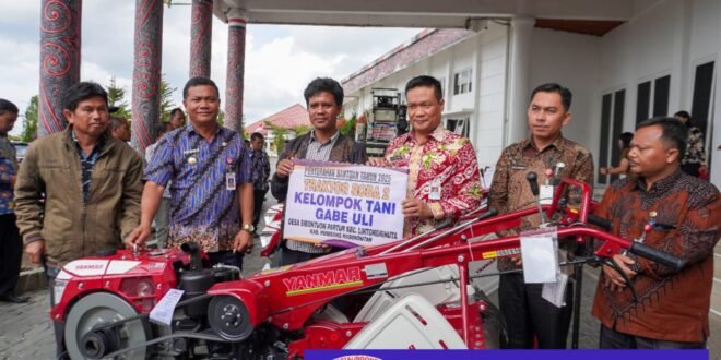 Bupati Humbang Hasundutan Dr Oloan Paniaran Nababan menyerahkan bantuan alat-alat dan mesin pertanian (Alsintan) kepada kelompok tani, anggarannya bersumber dari APBN Kementerian Pertanian 2025, Kamis 30 Oktober 2025 di Pelataran Perkantoran Bupati Humbang Hasundutan, Bukit Inspirasi Doloksanggul.