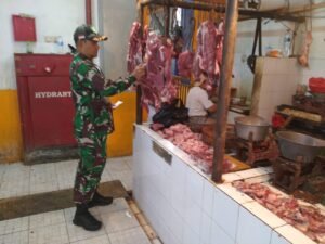 Portalindonews.com | Kodam Jaya, Jakarta Barat _ Personil Koramil 01/Tamansari Kodim 0503/Jakarta Barat, Babinsa Serka Kusnudin turun kepasar dan berinteraksi dengan para pedagang dan para pengunjung agar dapat mengetahui perkembangan harga bahan pokok di pasar Gg Kancil Jalan Keamanan, Kelurahan Keagungan Kecamatam Tamansari Jakarta Barat. Selasa (14/01).