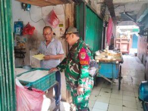 Babinsa Pelda Ery Hendrawan melakukan pengecekan terhadap harga-harga kebutuhan pokok seperti beras, minyak goreng, gula pasir, telur, dan sayur-mayur, serta berdialog dengan para pedagang untuk mengetahui kondisi distribusi dan pasokan barang.