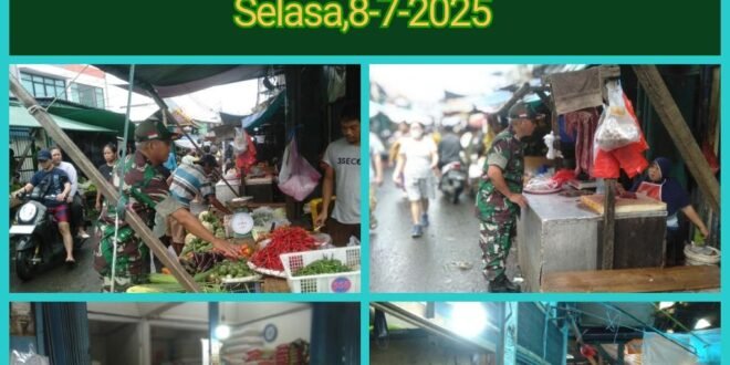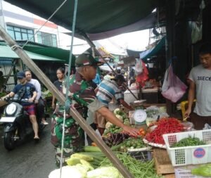 Portalindonews.com | Kodam Jaya, Kodim 0503/JB _ Babinsa Koramil 01/Tamansari, Serma Wakdinator melaksanakan pengecekan ketersediaan harga sembako secara langsung di kios-kios dan pasar di PD Pasar Pecah Kulit Jalan Mabes XI, Kelurahan Pinangsia, Kecamatan Tamansari Jakarta Barat. Selasa (8/7).