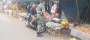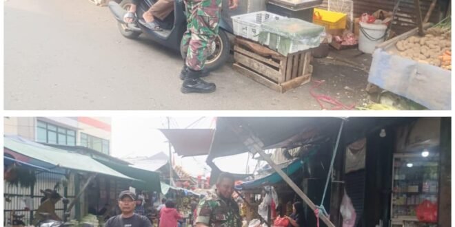 Babinsa Sertu Aprianto melaksanakan pengecekan ketersediaan harga sembako secara langsung di kios-kios dalam pasar dan berinteraksi dengan pedagang dan pembeli.