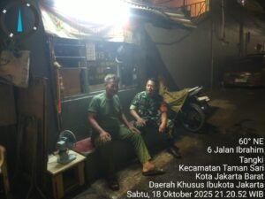 Portalindonews.com | Kodam Jaya, Jakarta Barat _ Guna meningkatkan rasa aman dan nyaman warga binaan di malam hari, Babinsa Koramil 01/Tamansari Kodim 0503/JB, Serka Suharno melaksanakan Siskamling dan Pam Swakarsa bersama Anggota Linmas di Pos-Pos Kamling yang ada di Wilayah Kecamatan Tamansari Kota Adm Jakarta Barat. Sabtu Malam pukul 21.00 Wib, (18/10/2025).
