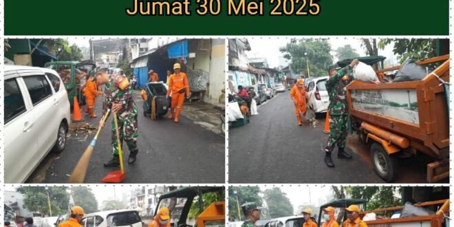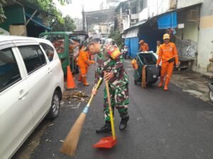 Portalindonews.com | Kodam Jaya, Kodim 0503/JB _ Dalam rangka menciptakan lingkungan bersih dan terhindar dari banjir serta jauh dari Wabah penyakit, Koramil 01/Tamansari melaksanakan Karya Bakti TNI yang di pimpin Babinsa Serka Kusnudin.