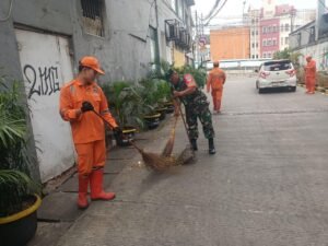 Portalindonews.com | Kodam Jaya, Jakarta Barat _ Babinsa Koramil 01/Tamansari Kodim 0503/JB, Serma Agus Priyono bersama PPSU melaksanakan kerja bakti di Jalan Kejayaan RW.01 dan RW.08, Kelurahan Krukut, Kecamatan Tamansari Jakarta Barat. Jumat (24/10).