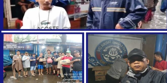 Portalindonews.com = JAKART BARAT _. Aksi sigap ketua RW 014 Cengkareng Timur H,Lili Sutarli terhadap warga yang terdampak banjir akibat di guyur hujan Senin malam sebagian wilayahnya Cengkareng Timur khususnya di wilayah RW 014 Senin ( 12/01/2026)