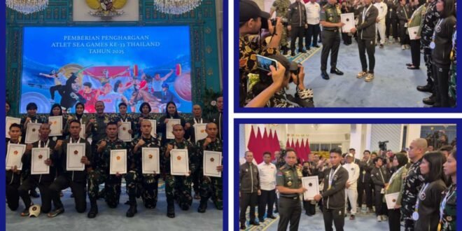 JAKARTA – Panglima TNI Jenderal TNI Agus Subiyanto memberikan penghargaan berupa Kenaikan Pangkat Luar Biasa (KPLB) terhadap Letnan Dua Infanteri Muhammad Alfi Kusuma menjadi Letnan Satu Infanteri pada acara pemberian bonus kepada atlet peraih medali SEA Games ke-33 Thailand tahun 2025 dari Presiden Republik Indonesia Prabowo Subianto, bertempat di Istana Negara, Jakarta, Kamis (8/1/2026).