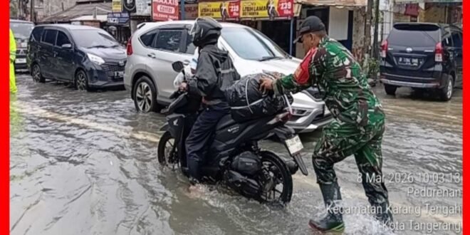 Portalindonews.com =KODAM JAYA, TANGERANG – Aksi dilakukan anggota Babinsa Koramil 04/Ciledug, Kodim 0506/Tgr saat membantu warga mendorong motor saat melintas banjir akibat hujan yang sangat tinggi, Minggu (08/03/2026).