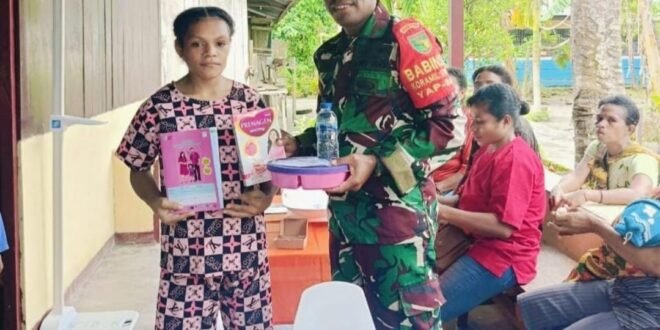 PORTALINDONEWS.COM | Babinsa Koramil 1707-07/Elikobel Kodim 1707/Merauke Serda Melkisedek Urbata melaksanakan pendampingan sekaligus membantu petugas kesehatan Puskesmas Bupul dalam menggelar Posyandu Balita di Kampung Kweel Distrik Elikobel Kabupaten Merauke, Provinsi Papua Selatan, Sabtu (13/7/2024).