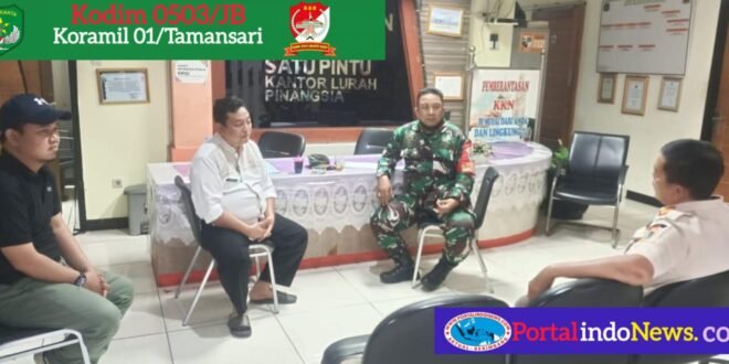 Komsos Babinsa dengan aparat kelurahan di Jalan Mangga dua III, no. 111, RW. 03 Kelurahan Pinangsia, Kecamatan Tamansari Jakarta barat guna menjalin silaturahmi, membangun kedekatan, mencari informasi dan memperkuat kemanunggalan TNI dan Rakyat, menjaga stabilitas wilayah, dan mendukung tugas pembinaan teritorial.