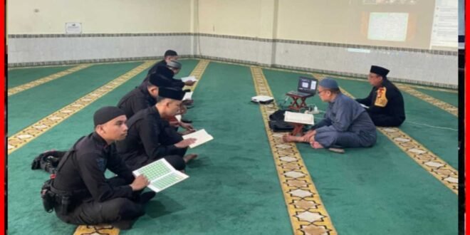JAKARTA – Personel Batalyon A Pelopor Satuan Brimob Polda Metro Jaya melaksanakan kegiatan tadarus Al-Qur’an sebagai bagian dari program pembinaan rohani dan mental selama bulan suci Ramadan di Masjid At-Taubah, Kamis (12/3/2026). Kegiatan ini diikuti anggota yang tidak sedang menjalankan penugasan setelah pelaksanaan apel pagi di lingkungan Mako Batalyon A Pelopor.