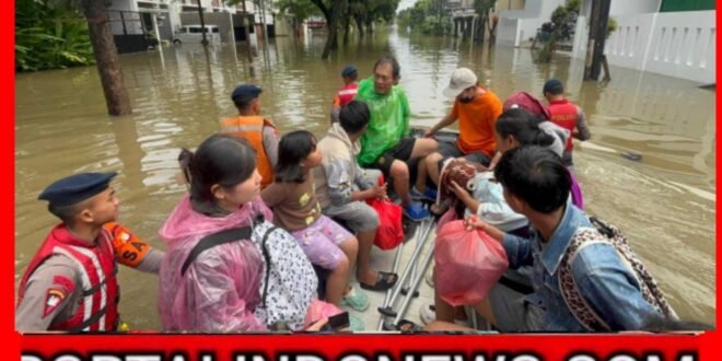TANGERANG – Banjir setinggi sekitar satu meter merendam kawasan Perumahan Duren Villa, Ciledug, Kota Tangerang, Minggu (8/3/2026) pagi. Tim SAR Batalyon C Pelopor Satuan Brimob Polda Metro Jaya turun langsung ke lokasi untuk membantu warga yang terdampak sekaligus melakukan evakuasi menggunakan perahu karet.