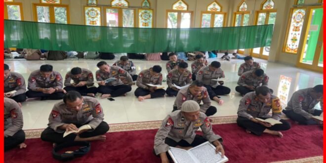 CIKARANG – Personel Satbrimob Polda Metro Jaya Batalyon D Pelopor bersama Bhayangkari Ranting Batalyon D melaksanakan tadarus Al-Qur’an di Masjid Al-Amin, Kamis (5/3/2026) pukul 08.00 WIB. Agenda usai apel pagi tersebut menjadi bagian dari pembinaan rohani selama Ramadan, sekaligus memperkokoh integritas dan kedisiplinan dalam menjalankan tugas kepolisian.