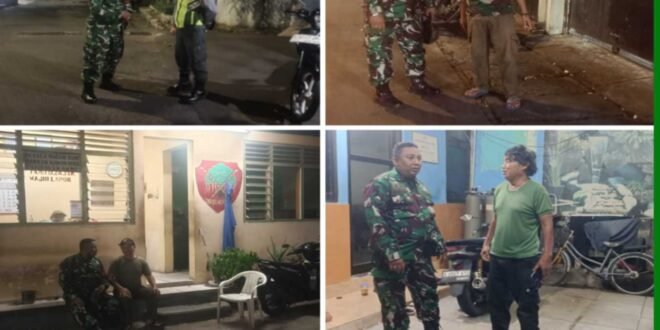 mengoptimalkan pengawasan dan pengendalian wilayah, Babinsa Koramil 01/Tamansari, sertu Aprianto bersama Komponen Pendukung Wanra dan Mitra Jaya melakukan giat patroli Siskamling/Pam Swakarsa pada Sabtu Malam (29/11).