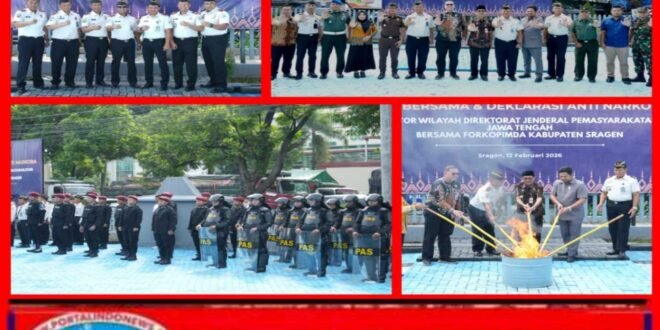 Portalindonews.com = SRAGEN – Komitmen kuat dalam memerangi peredaran dan penyalahgunaan narkoba di lingkungan pemasyarakatan kembali ditegaskan melalui kegiatan Apel Bersama dan Deklarasi Anti Narkoba yang diselenggarakan oleh Kantor Wilayah Direktorat Jenderal Pemasyarakatan Jawa Tengah. Kegiatan ini dipusatkan di Lembaga Pemasyarakatan Kelas IIA Sragen dan dihadiri seluruh Kepala Unit Pelaksana Teknis (UPT) Pemasyarakatan se-Jawa Tengah, Badan Narkotika Nasional (BNN) Kota Surakarta, serta jajaran Forum Koordinasi Pimpinan Daerah (Forkopimda) Kabupaten Sragen, Kamis (12/02).