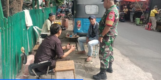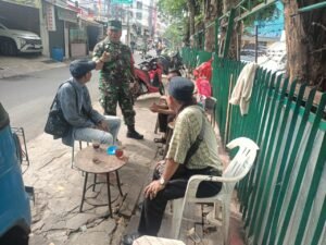 Portalindonews.com | Kodam Jaya, Jakarta Barat _ Babinsa Koramil 01/Tamansari Kodim 0503/JB, Serma Agus Priyono melaksanakan Komunikasi Sosial (Komsos) bersama masyarakat di Jalan Mangga Besar IX, RW.02 Kelurahan Tangki, Kecamatan Tamansari Jakarta Barat. Minggu (28/9).