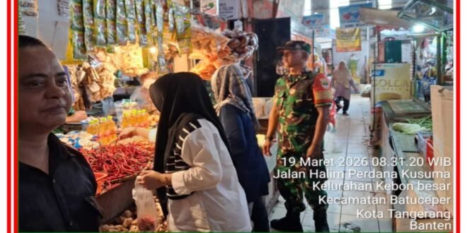 Portalindonews.com =          KODAM JAYA, TANGERAN //– Dalam rangka menjaga stabilitas harga bahan pokok menjelang lebaran Babinsa Koramil 02/Btc Jajaran Kodim 0506/Tgr melaksanakan kegiatan pemantauan wilayah dengan mendatangi Pasar tradisional di wikayah Kodim 0506/Tgr.