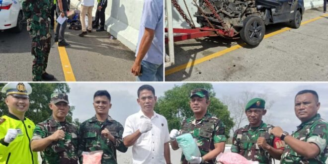BAKAHUNI //. Komandan Kodim 0411/KM Letkol Inf Noval Darmawan, S.H., M.I.P. didampingi Pasi Intel Kapten Inf Zainuri datangi langsung lokasi terjadinya lakalalin kendaraan roda 4 bertempat di jalan Tol Sumatra jalur B Terbanggi – Bakahuni KM 136, Kamis (20/11/2025).