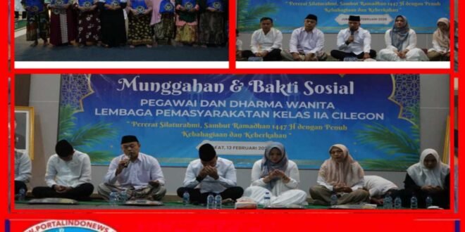 Portalindonews.com = CILEGON, — Dalam rangka menyambut datangnya bulan suci Ramadhan 1447 Hijriah, jajaran pegawai dan Dharma Wanita Persatuan (DWP) Lembaga Pemasyarakatan Kelas IIA Cilegon, Kantor Wilayah Direktorat Jenderal Pemasyarakatan Banten, menggelar kegiatan munggahan yang dirangkaikan dengan bakti sosial kepada masyarakat sekitar. Mengusung tema “Pererat Silaturahmi, Sambut Ramadhan 1447 dengan Penuh Kebahagiaan dan Keberkahan”, kegiatan ini berlangsung dengan penuh kehangatan dan kebersamaan pada hari Jum’at (13/2/26).