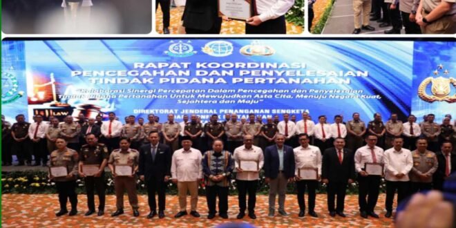 JAKARTA // – Pada Rapat Koordinasi (Rakor) Pencegahan dan Penyelesaian Tindak Pidana Pertanahan Tahun 2025, Menteri Agraria dan Tata Ruang/Kepala Badan Pertanahan Nasional (ATR/BPN), Nusron Wahid, menyematkan pin emas dan memberikan piagam penghargaan kepada pihak yang berperan dalam pencegahan serta penyelesaian tindak pidana pertanahan. Apresiasi ini diberikan kepada 74 pihak yang terdiri dari jajaran Kementerian ATR/BPN, Kepolisian, dan Kejaksaan dari 21 provinsi di Indonesia.