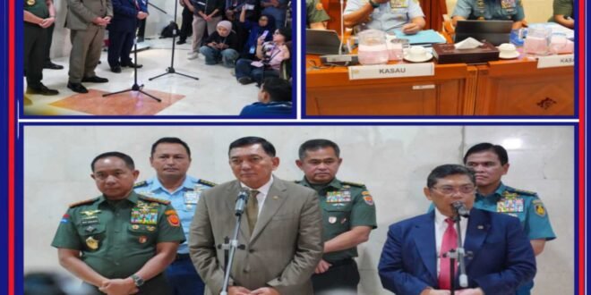 JAKARTA. (Puspen TNI). Panglima TNI Jenderal TNI Agus Subiyanto bersama Kasad, Kasal dan Kasau mendampingi Menteri Pertahanan Republik Indonesia Sjafrie Sjamsoeddin dalam rapat kerja bersama Komisi I DPR RI yang digelar secara tertutup di Ruang Rapat Komisi I DPR RI, Senayan, Jakarta Pusat, Senin (26/1/2026).