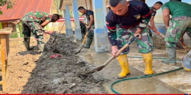 ACEH TENGAH, tniad.mil.id — Pascabanjir bandang dan tanah longsor yang menerjang wilayah Kecamatan Linge, Satgas Penanggulangan Bencana Alam (Gulbencal) Kodim 0106/Aceh Tengah bersama prajurit Yonif TP 854/DK dan warga menuntaskan pembersihan material lumpur serta kayu di SMPN 26 Takengon, Desa Reje Payung, Sabtu (14/2/2026). Dengan rampungnya pekerjaan tersebut, sekolah kini kembali siap digunakan untuk kegiatan belajar mengajar.