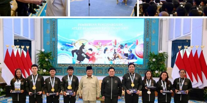 JAKARTA (Puspen TNI). __ Panglima TNI Jenderal TNI Agus Subiyanto menghadiri acara penyerahan penghargaan dan bonus kepada para atlet serta pelatih Indonesia peraih medali pada ajang SEA Games ke-33 Thailand Tahun 2025. Penghargaan tersebut diserahkan langsung oleh Presiden Republik Indonesia Prabowo Subianto di Istana Negara, Jakarta, Kamis (8/1/2026), sebagai bentuk apresiasi negara atas prestasi dan dedikasi para atlet yang telah mengharumkan nama bangsa di tingkat internasional.