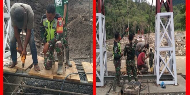 Portalindonews.com = ACEH TENGAH, tniad.mil.id – Pembangunan jembatan gantung sepanjang 120 meter di Desa Burlah, wilayah teritorial Kodim 0106/Aceh Tengah, terus menunjukkan progres signifikan. Hingga Kamis (26/2/2026), capaian pekerjaan telah menembus 57,06 persen.