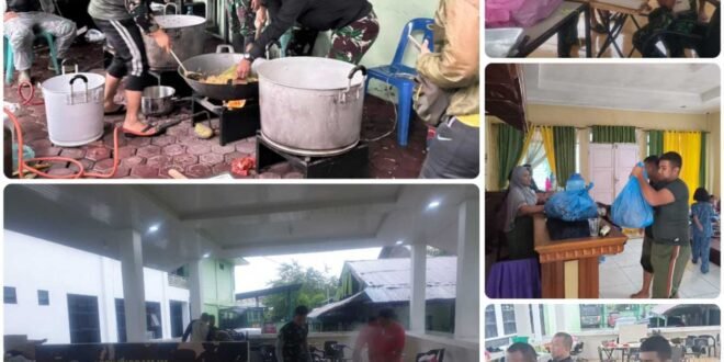 ACEH UTARA //, tniad.mil.id — Intensitas hujan tinggi yang melanda wilayah Aceh Utara dan Kota Lhokseumawe dalam beberapa hari terakhir menyebabkan ribuan rumah terendam serta memaksa banyak warga mengungsi. Debit air yang terus meningkat, lumpur tebal, dan kerusakan fasilitas umum membuat penanganan darurat menjadi prioritas. Menyikapi kondisi tersebut, TNI Angkatan Darat melalui Kodam Iskandar Muda (IM) mengerahkan prajurit Korem 011/Lilawangsa untuk mendirikan dapur lapangan guna memenuhi kebutuhan pangan masyarakat terdampak, Jumat (28/11/2025).
