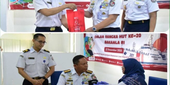 JAKARTA – Bakamla RI menggelar kegiatan donor darah dalam rangka memperingati Hari Ulang Tahun (HUT) ke-20. Kegiatan ini diikuti oleh seluruh personel, di Mabes Bakamla RI, Jakarta Pusat, Senin (22/12/2025).