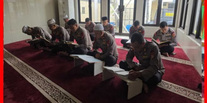 JAKARTA BARAT – Personil Detasemen Gegana Satbrimobda Metro Jaya melaksanakan kegiatan Tadarus Al-Qur’an di bulan Ramadan 1447 H, Kamis (5/3/2026). Kegiatan berlangsung pukul 08.00 WIB hingga selesai di Mushola Al-Hikmah Detasemen Gegana Satbrimobda Metro Jaya dan dipimpin oleh AKP Eko Yudianto.
