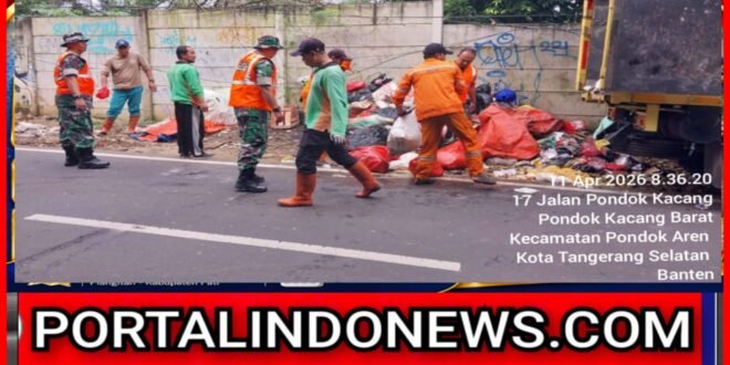 KODAM JAYA , TANGERANG – Koramil 07/Pondok Aren, Dinas Lingkungan Hidup (DLH), dan Polsek Pondok Aren menggelar aksi bersih lingkungan di Kelurahan Pondok Kacang Barat, Kecamatan Pondok Aren, Tangerang Selatan, Sabtu (11/4/2026) pagi. Kegiatan ini menyasar sejumlah titik permukiman dan saluran lingkungan yang dinilai perlu perhatian segera.