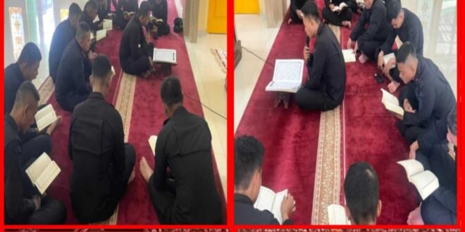 Rangkaian tadarus dibuka dengan doa yang dipimpin pimpinan satuan. Dipandu Ustadz Muhammad Ikhsan, para peserta membaca Juz 10, mulai dari Surat Al‑Anfal ayat 41 hingga Surat At‑Taubah ayat 93, secara bergantian. Kekhusyukan anggota saat membaca Al‑Qur’an menciptakan suasana tenang dan hangat, sementara kehadiran Bhayangkari menambah semangat kebersamaan di bulan suci.