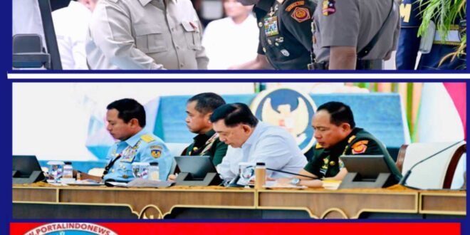 Portalindonews.com = JAKARTA // (Puspen TNI). Panglima TNI Jenderal TNI Agus Subiyanto bersama Menteri Pertahanan RI Sjafrie Sjamsoeddin serta Kepala Staf TNI Angkatan Darat Jenderal TNI Maruli Simanjuntak, Kepala Staf TNI Angkatan Laut Laksamana TNI Muhammad Ali, dan Kepala Staf TNI Angkatan Udara Marsekal TNI Mohamad Tonny Harjono menghadiri Rapat Pimpinan (Rapim) TNI–Polri yang dipimpin langsung oleh Presiden Republik Indonesia Prabowo Subianto di Istana Negara, Jakarta Pusat, Senin (9/2/2026).