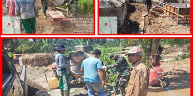 PASAMAN – TNI Angkatan Darat melalui Kodim 0305/Pasaman terus memacu pembangunan Jembatan Gantung Equator di Jorong Kampung Alai, Nagari Ganggo Mudik, Kecamatan Bonjol, Kabupaten Pasaman, Sumatera Barat, Selasa (10/2/2026). Pembangunan infrastruktur ini menjadi wujud nyata kemanunggalan TNI AD dengan rakyat dalam mendukung percepatan pembangunan wilayah pedesaan.