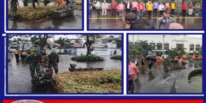 KODAM JAYA, JAKARTA _ Bati Tuud Koramil 01/Tamansari Kodim 0503/JB Peltu Anton Sugiatno wakili Pgs Danramil Mayor Inf Zein Nurohman dalam giat apel Kerja Bakti Gabungan Tiga Pilar Kecamatan Tamansari Jakarta Barat yang laksanakan di Plaza Beos Kawasan Kota Tua Jakarta Kelurahan Pinangsia Kecamatan Tamansari. Minggu, 08 Februari 2026. Pada pukul 07.00 Wib